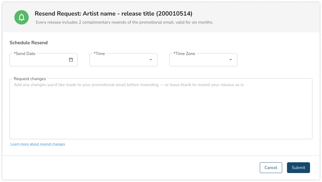 Add Send Date, Time, and Time Zone for your resend and include any changes you’d like to see in your email. If you are satisfied with your original promotional info as is, feel free to leave this field blank. Once you’ve added your updates, click “Submit”.